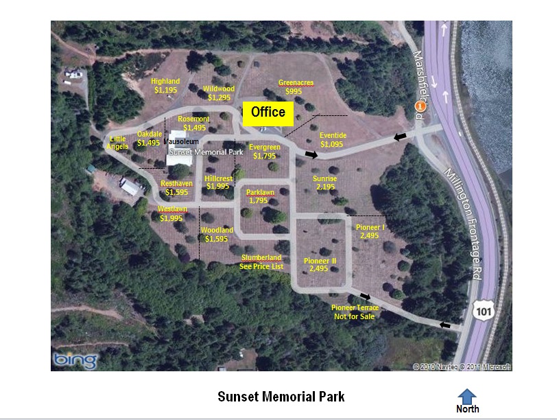 The 40-acre park is the home of the only mausoleum, columbarium and cremation garden in Coos Bay. Sunset offers private or public services at the gravesite with a portable chapel, in the mausoleum chapel or you may choose one of our other location chapels. A large selection of burial spaces, cremation spaces, crypts, niches, headstones, markers, monuments, benches, burial and urn vaults, caskets, urns, cremation jewelry, keep sakes, printed material and video tributes are available at the time of need or in advance by preplanning.